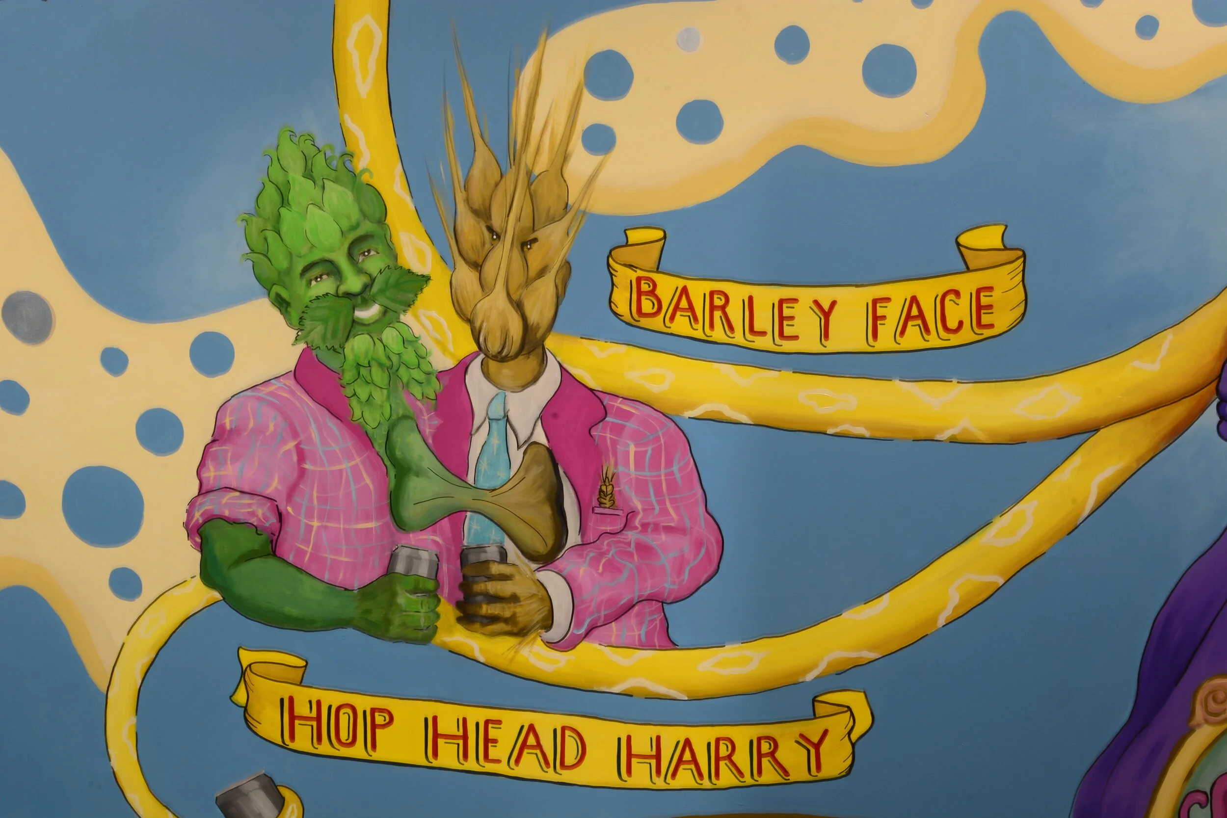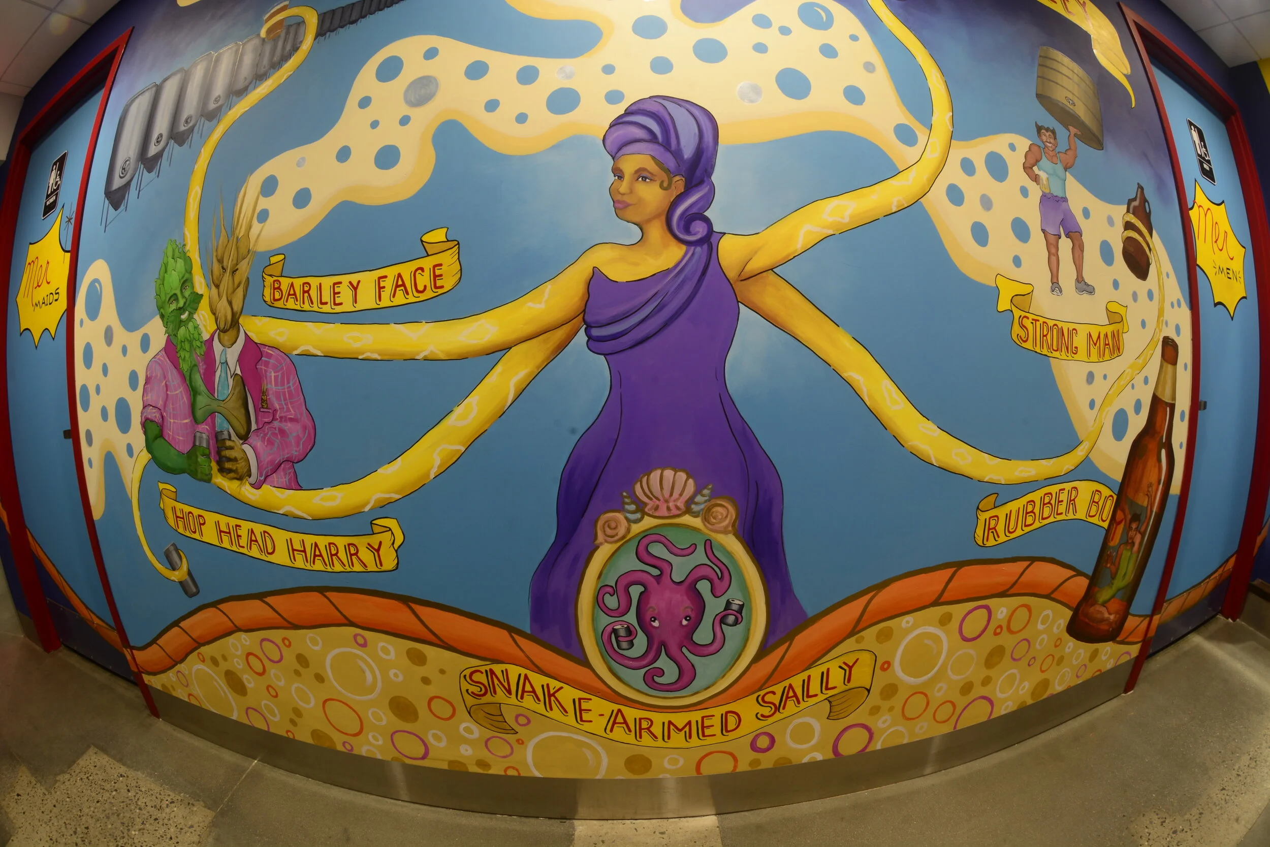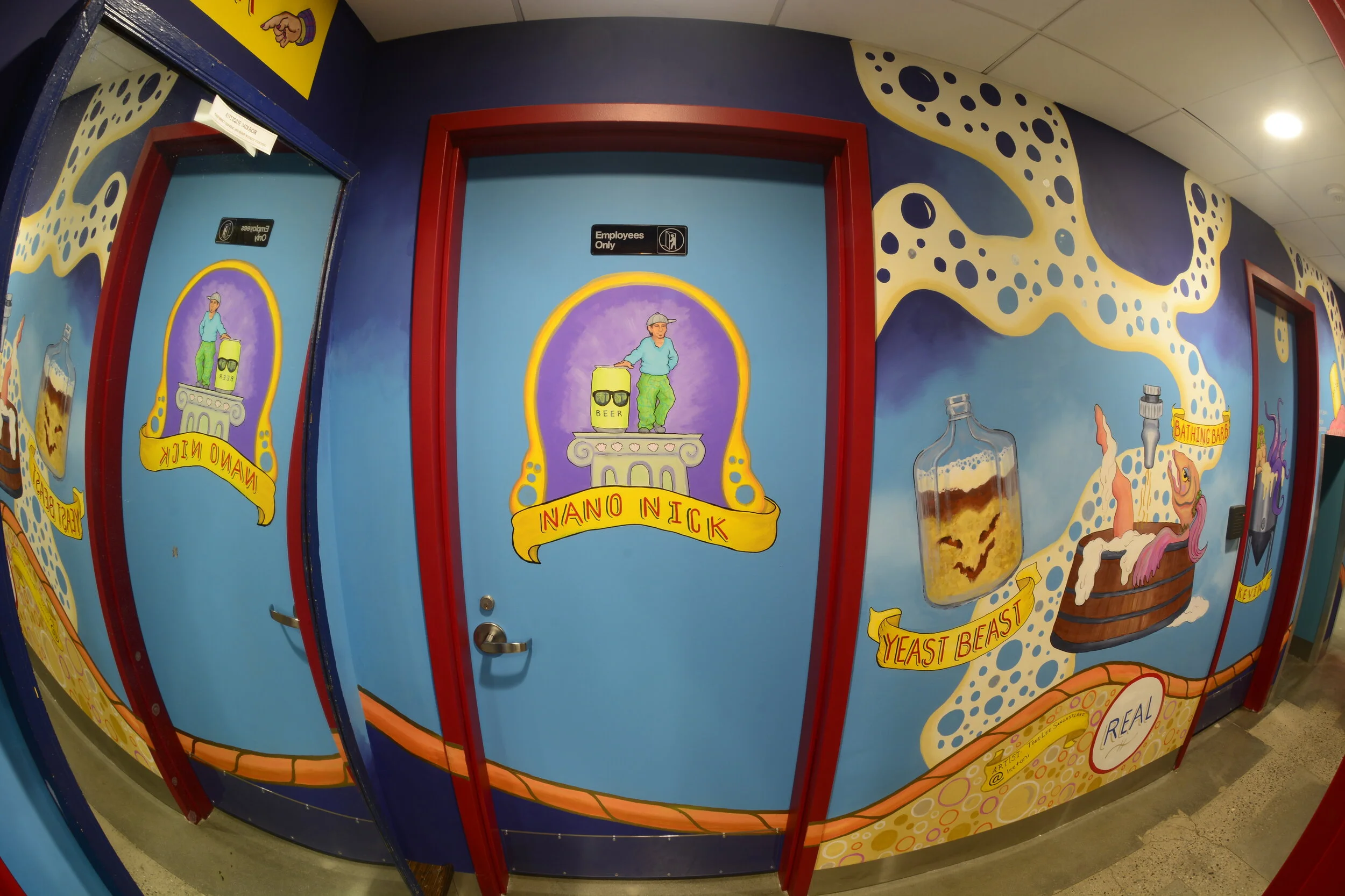 The anti-graffiti coat is — Exterior Performance Coatings, Inc VandlGuard IsoFree Urethane Non-Sacrificial Anti-Graffiti Wall & Mural | Low Temp 40°F in clear satin finish. Since the mural is in a hallway with a lot of traffic….brewery + bathrooms, leaning on the wall while you wait for the bathrooms…you get the point, it will now be safely protected and easily cleaned as needed. The only problems now will be with the traffic jams ogling the art in the hallway while trying to get to the restrooms!!!!